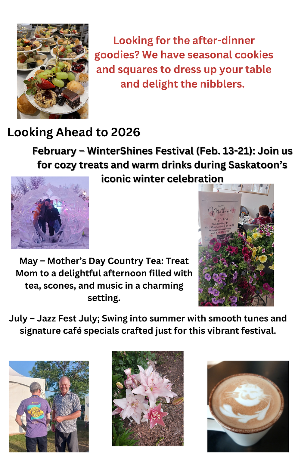 July (Jazz Fest): Swing into summer! We will have smooth tunes and signature café specials crafted specifically for this vibrant festival.